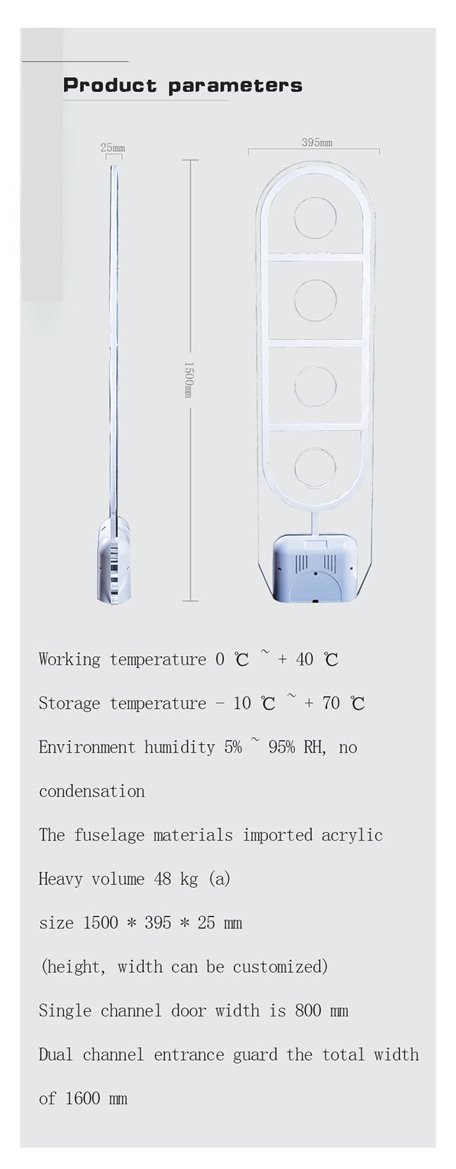 Features description: ◇ magnetic compatibility: compatible with all types of security EAS magnetic stripe, can be monitored over the magnetic stripe 6CM. ◇ channel width: the use of magnetic stripe, the channel can be achieved from the 80-90CM, the use of hard tags from the channel to reach 100-120CM. ◇ comprehensive sensitivity: the use of electromagnetic anti-theft technology, the small blind, integrated in more than 98% sensitivity. ◇ stability: the stability of high-performance equipment, anti-electronic jamming ability, the general effect of electronic noise immune, the aluminum foil, foil packaging of goods also have protection. ◇ dual alarm; When magnetizing the magnetic stripe through the monitoring channel, the sound and lighting system provides a warning signal double; adjustable alarm volume set the size and duration. ◇ The number of statistics: the number with the cumulative function of the day can generate traffic, traffic statistics function. ◇ be composed of multi-channel; available on-line composition of the needs of three-channel, four-channel and five channels. Green ◇: Product output power of only 6W, in line with the ultra-low frequency electromagnetic wave detection technology, the human body without radiation, no pollution to the environment, more than 10 years service life. ◇ quality assurance: in line with national standards for eight consecutive years through the ISO9001: 2000 international quality system certification.
