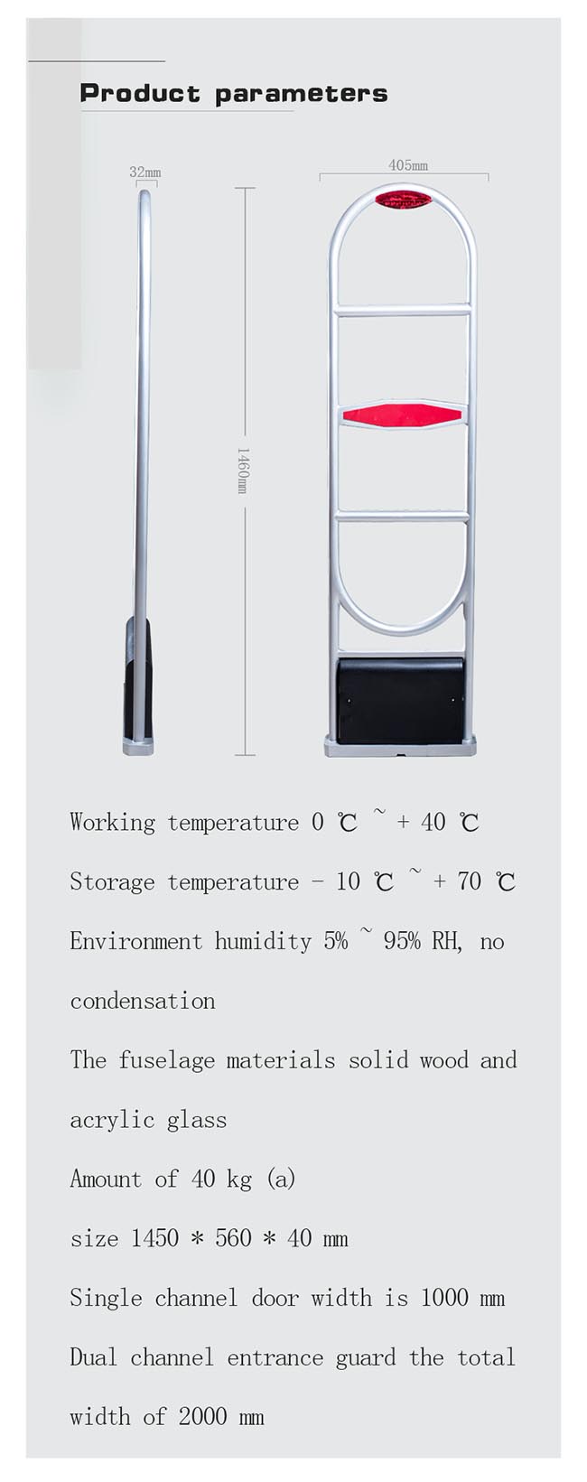 ◇ magnetic compatibility: compatible with all types of security EAS magnetic stripe, can be monitored over the magnetic stripe 6CM. ◇ channel width: the use of magnetic stripe, the channel can be achieved from the 80-90CM, the use of hard tags from the channel to reach 100-120CM. ◇ comprehensive sensitivity: the use of electromagnetic anti-theft technology, the small blind, integrated in more than 98% sensitivity. ◇ stability: the stability of high-performance equipment, anti-electronic jamming ability, the general effect of electronic noise immune, the aluminum foil, foil packaging of goods also have protection. ◇ dual alarm; When magnetizing the magnetic stripe through the monitoring channel, the sound and lighting system provides a warning signal double; adjustable alarm volume set the size and duration. ◇ be composed of multi-channel; available on-line composition of the needs of three-channel, four-channel and five channels. Green ◇: Product output power of only 6W, in line with the ultra-low frequency electromagnetic wave detection technology, the human body without radiation, no pollution to the environment, more than 10 years service life. ◇ quality assurance: in line with national standards for eight consecutive years through the ISO9001: 2000 international quality system certification.