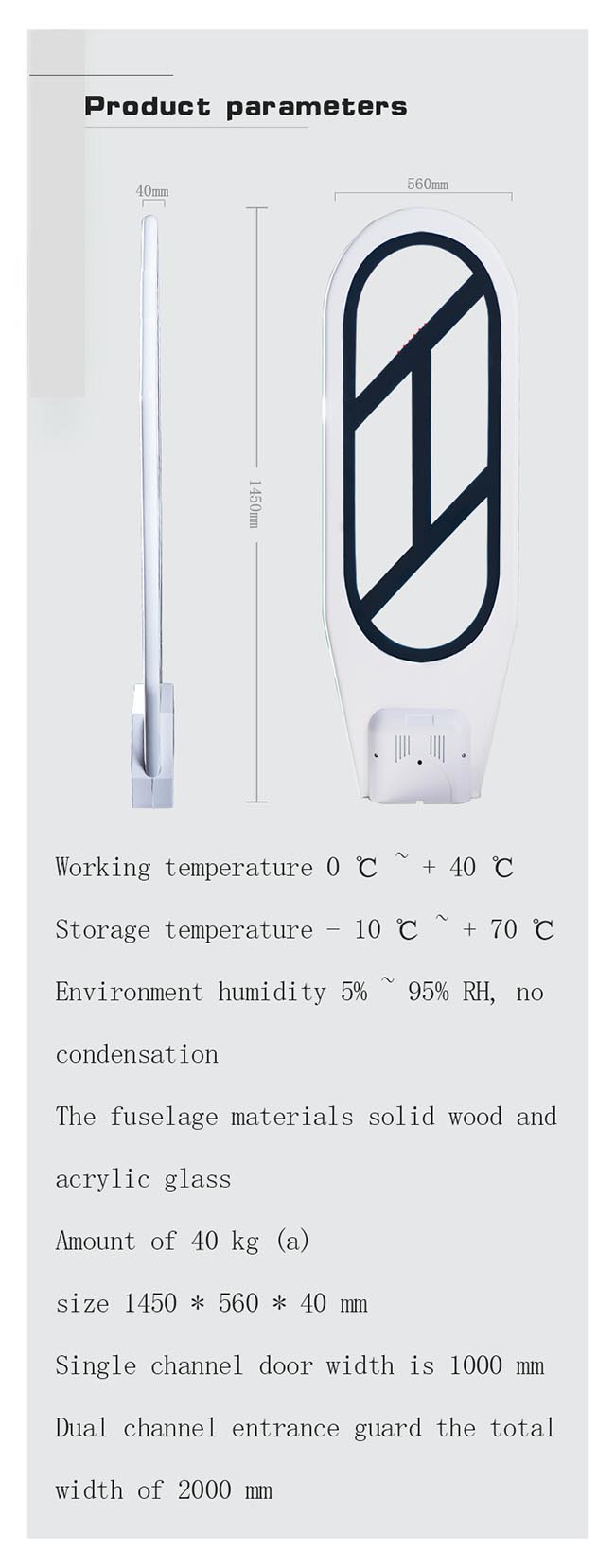 Name: SJX - type intelligent anti magnetic anti-theft device Working voltage: AC: 220V + 20%, 50Hz Work environment: - 10 to 40 DEG C Material: high resin material Detection of strip length: cobalt-based tape over 5cm Monitor height: 1700mm Monitoring width: single path 800 -900 dual path 1600-1800( mm ) Dimensions: 1450 x 620 x 40 ( mm )