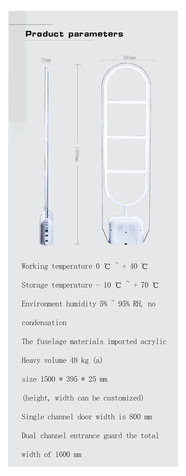 Features description: ◇ magnetic compatibility: compatible with all types of security EAS magnetic stripe, can be monitored over the magnetic stripe 6CM. ◇ channel width: the use of magnetic stripe, the channel can be achieved from the 80-90CM, the use of hard tags from the channel to reach 100-120CM. ◇ comprehensive sensitivity: the use of electromagnetic anti-theft technology, the small blind, integrated in more than 98% sensitivity. ◇ stability: the stability of high-performance equipment, anti-electronic jamming ability, the general effect of electronic noise immune, the aluminum foil, foil packaging of goods also have protection. ◇ dual alarm; When magnetizing the magnetic stripe through the monitoring channel, the sound and lighting system provides a warning signal double; adjustable alarm volume set the size and duration. ◇ The number of statistics: the number with the cumulative function of the day can generate traffic, traffic statistics function. ◇ be composed of multi-channel; available on-line composition of the needs of three-channel, four-channel and five channels. Green ◇: Product output power of only 6W, in line with the ultra-low frequency electromagnetic wave detection technology, the human body without radiation, no pollution to the environment, more than 10 years service life. ◇ quality assurance: in line with national standards for eight consecutive years through the ISO9001: 2000 international quality system certification.