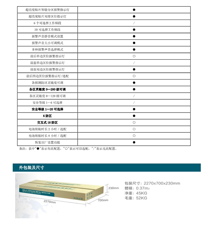 該款性能良好的安檢門具有以下優(yōu)點:金屬探測靈繳度較高;抗干擾能力強;多個探測區(qū)域,每個區(qū)域都可以單獨設置靈敏度;自診斷程序,.上電自檢;采用高強度材料,能防火,防腐蝕,防震等;可以實時監(jiān)視的背景環(huán)境干擾。